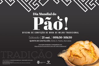 Para assinalar o Dia Mundial do Pão, a Câmara de Barcelos, em parceria com a Associação Couto Vivo, vai promover, no próximo sábado, uma oficina de confeção de broa de milho tradicional, na Quinta de Castelhão, em Alvito S. Pedro.