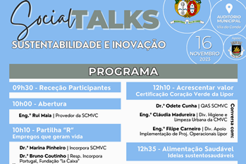 A Santa Casa da Misericórdia de Vila do Conde vai promover, na próxima quinta-feira, no Auditório Municipal, o evento Social Talks, que tem como tema a sustentabilidade e inovação. O seminário decorrerá entre as 9h30 e as 13h00. A participação é gratuita, mas as inscrições são obrigatórias e limitadas aos lugares existentes. Devem ser feitas através do link https://docs.google.com/forms/d/e/1FAIpQLSfVlKr6fFJ1VMVr8BxSTDEcQJjnuBFb3xwETvejrQpaZelYiA/viewform?usp=sf_link até à próxima terça-feira.