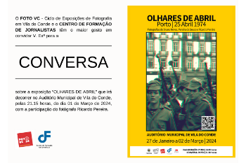 Hoje, às 21h15, há uma conversa sobre a exposição “Olhares de Abril”, no Auditório Municipal de Vila do Conde, com a participação do fotógrafo Ricardo Pereira. A mostra reúne um conjunto de trabalhos, captados em diversos pontos da cidade do Porto pelas lentes dos fotógrafos Bruno Neves, Pereira de Sousa e Ricardo Pereira que, naqueles dias de 1974, fizeram da luta e da festa de Abril o seu foco. Organizada pelo CFJ - Centro de Formação de Jornalistas e pelo Instituto Multimédia, a exposição está, agora, em Vila do Conde, no Auditório Municipal, até ao próximo sábado e é a 33.ª mostra do ciclo de fotografia “FOTO VC”.