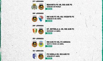 A Liga divulgou o calendário de jogos do Rio Ave até à jornada 31. O próximo desafio será a 30 de março, um sábado, fora de casa, frente ao Boavista, com apito inicial para as 18h. O regresso a casa sucede na jornada 28, no dia 6 de abril, outro sábado, com a receção ao Gil Vicente agendada para as 15h30. O desafio seguinte será num domingo, dia 14 de abril, na Amadora, com arranque às 15h30.