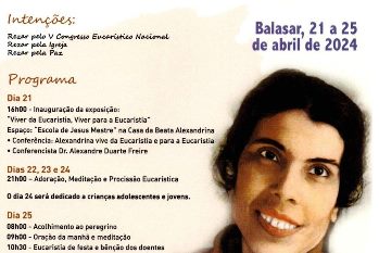 O programa inicia-se com a inauguração da exposição “Viver da Eucaristia, Viver para a Eucaristia”, marcada para as 16h00 de domingo, no espaço “Escola de Jesus Mestre” na Casa-Museu da Beata Alexandrina. A exposição será complementada com uma conferência de Alexandre Duarte Freire, intitulada “Alexandrina vive da Eucaristia e para a Eucaristia”. Depois, nos dias 22, 23 e 24 haverá, a partir das 21h00, adoração, meditação e procissão eucarística no santuário. O dia 24 é dedicado a crianças, adolescentes e jovens.