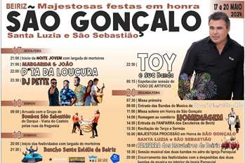 Esta sexta-feira à noite, as festas de São Gonçalo, Santa Luzia e São Sebastião contam com atividades dedicadas especialmente aos mais jovens. O primeiro espetáculo musical tem início às 21h, com a presença dos músicos Margarida & João. Mais tarde, a animação continua com as batidas de DJ Pette, a partir das 23h30. No dia seguinte, às 9h, os Bombos São Sebastião vão despertar as ruas da freguesia com música garantida durante toda a manhã. A noite de domingo vai ser de arromba, começando pela atuação do Rancho Santa Eulália, às 21h30, sendo depois a vez do músico Toy subir ao palco junto com a banda, prometendo animar os beirizenses até à meia noite, altura em que começa o tradicional fogo de artifício. Na segunda-feira, pode assistir à procissão em honra dos santos homenageados às 16h, mas de manhã ainda haverá missa solene às 11h.