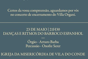 Termina hoje, na Igreja da Misericórdia, em Vila do Conde, o ciclo de concertos de órgão “Villa Organi”. O espetáculo está marcado para as 21h30 e tem como título ‘Danças e Ritmos do Barroco Espanhol’, sendo o quarto e último do evento que decorreu este mês. Esta atuação terá como protagonistas Arturo Barba (órgão) e Onofre Serer (percussão). O evento tem entrada livre e é promovido pela Santa Casa da Misericórdia de Vila do Conde. A data original do concerto era amanhã, mas foi necessário antecipar para hoje devido ao início dos festejos de São João.