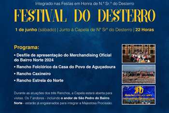 Este sábado, a partir das 22h, decorre mais um Festival do Desterro, organizado pela Juvenorte, junto à Capela de Nossa Senhora do Desterro. O programa promete um desfile de apresentação do Merchandising Oficial do Bairro Norte 2024 e atuações de três ranchos: da Casa do Povo de Aguçadoura, Caxineiro e Estrela do Norte. A capela estará aberta para visitas com os 7 andores já engalanados para integrar a Majestosa Procissão de domingo à tarde.