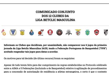 Afinal hoje já não há jogo entre o FC Porto e o CD Póvoa. A partida de arranque da Liga de basquetebol foi adiada, tal como os restantes desafios da jornada inaugural, segundo os próprios clubes comunicaram esta manhã. A decisão de não comparecer foi tomada por unanimidade e a Federação aceitou reagendar os jogos para datas a definir. Na origem do problema está o atraso nas inscrições de jogadores estrangeiros por parte dos 12 emblemas do escalão principal. A situação atinge sobretudo os atletas norte-americanos pela falta de concessão de autorização de residência. O objetivo dos participantes no campeonato é ter a situação resolvida a tempo de ser realizada a jornada 2 com normalidade. O duelo do CDP com o Esgueira está marcado para as 18h do dia 12 de outubro, mas nesta altura carece de confirmação que venha mesmo a ser realizado.