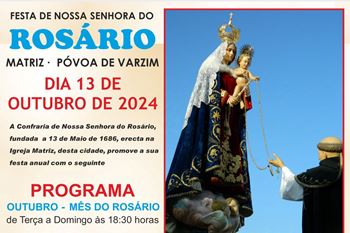 A festa religiosa de Nossa Senhora do Rosário conhece este domingo um dos pontos altos. Depois da missa solene matinal na Igreja Matriz, às 15h30 vai sair do Auditório Musical a Banda Musical da Póvoa de Varzim que passará pela Rua Sr. do Bonfim, pela Rua 1º de Maio e pela Rua da Conceição. Às 16h, chega o tão esperado momento, com a saída da majestosa Procissão, que conta com mais de 300 anos de tradição. O cortejo religioso vai contar com a participação do Grupo dos Escuteiros da Matriz, seguido pelos andores de Nossa Senhora de Fátima, Nossa Senhora da Conceição (padroeira da cidade e da Igreja Matriz) e Nossa Senhora do Rosário. O itinerário é o seguinte: Rua da Igreja; Rua do Visconde; Largo Eça de Queirós; Praça do Almada; Rua Dr. Sousa Campos; Praça da República; Rua da Junqueira; Largo Dr. David Alves; Rua da Alegria; Avenida Mouzinho de Albuquerque; Largo das Dores e Rua de S. Pedro. A organização está a cargo da Confraria de Nossa Senhora do Rosário.