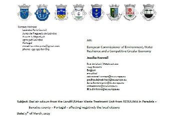 Nos últimos dias voltou a cheirar mal em redor do aterro da Resulima em Paradela. O alerta chega novamente da junta de freguesia de Laundos, que tem assumido um papel de porta-voz da indiganação popular de várias localidades vizinhas. A entidade presidida por Félix Marques deu conta de ter enviado uma carta à nova Comissária Europeia para o Ambiente, a sueca Jessika Roswall. A missiva seguiu ontem para Bruxelas após mais um dias de odores insuportáveis em Laundos e arredores.