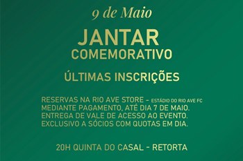 O Rio Ave comemora a 10 de maio o 86.º aniversário. O programa de festejos está a chegar ao fim depois de vários momentos já decorridos: a ‘Caminhada Verde e Branca’, a cerimónia de entrega dos emblemas aos sócios e o convívio de antigos atletas e dirigentes. Esta sexta-feira, dia 9 de maio, decorre o jantar comemorativo oficial, no qual se reúne à mesa toda a família rioavista. No sábado encerram-se as comemorações: a partir das 10h, na sede do clube, na Praça da República, será cantado o hino e hasteada a bandeira, seguindo-se as romagens de saudade aos cemitérios de Vila do Conde (11h) e Caxinas (11h30), ficando a Eucaristia Solene em memória dos sócios já falecidos, na Igreja Matriz, para as 19h.