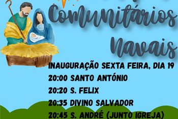 É esta noite a inauguração dos presépios comunitários de Navais. São quatro espalhados pela freguesia e serão dados a conhecer a partir das oito da noite, começando em Santo António, seguindo depois para São Félix (20h20), Divino salvador (20h35) e Santo André, junto à Igreja (20h45). O momento será abrilhantado pelo Grupo Coral de Navais e pelos participantes da Colónia de Férias do Natal.