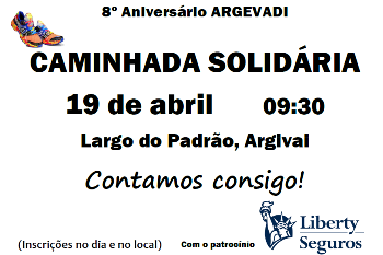 Depois da sessão solene do passado fim-de-semana, prosseguem as comemorações do oitavo aniversário da Argevadi. A IPSS de Argivai promove uma Caminhada Solidária na manhã do próximo domingo com início às 9h30 no Largo do Padrão. A inscrição custa dois euros e pode ser feita na junta de freguesia ou no próprio dia, revertendo a verba angariada para ajudar a pagar a construção da creche da instituição.