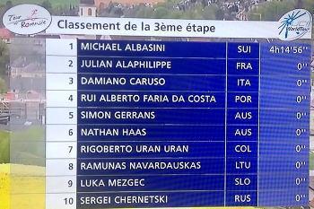 Rui Costa foi quarto classificado na terceira etapa da Volta à Romandia (Suiça) e manteve a 32ª posição da geral individual. Numa tirada com algumas dificuldades montanhosas pelo meio, o ciclista poveiro terminou com o mesmo tempo do vencedor, novamente Michael Albasini, estando a 1 minuto e 1 segundo do suíço, líder da prova. O resultado voltou a garantir mais um ponto UCI a Rui Costa, mantendo-o provisoriamente no sexto posto do ranking internacional.