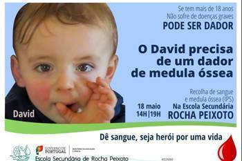 Vai passar pela Póvoa de Varzim mais uma campanha solidária para com uma criança que sofre de leucemia linfoblástica. A Escola Secundária Rocha Peixoto vai receber uma ação de recolha de sangue e de medula óssea para ajudar o David. A doença foi diagnosticada ao menino de apenas 28 meses no passado mês de Fevereiro. Depois de várias iniciativas que já decorreram ou ainda irão decorrer em diferentes localidades, também aos poveiros é agora dirigido o apelo para colaborarem na tarde do dia 18 de Maio, uma segunda-feira. Para isso precisa de ter entre 18 e 45 anos, mais de 50 quilos e ser saudável.