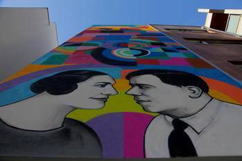 Há um novo mural gigante nas ruas de Vila do Conde. Para assinalar o 1.º centenário da presença de Sonia e Robert Delaunay na cidade, a fachada da escola primária Bento de Freitas tem, agora, um mural de arte urbana com seis metros de altura por três de largura. A obra foi coordenada pela pintora Isabel Lhano e executada pelos “grafiters” Arménio Torres e Manuel Martins sendo este último um poveiro de adoção. O mural, explicou Isabel Lhano, reúne excertos de obras e remata com os rostos do mítico casal que, entre 1915 e 1917, viveu em Vila do Conde e que esteve na vanguarda artística mundial no início do século XX. Os Delaunay, foram dois dos principais nomes do cubismo órfico, vieram para Portugal fugidos da 1.ª Guerra Mundial. Ela ucraniana, ele francês, amigos de Eduardo Viana e Amadeu Sousa Cardoso, influenciaram, diz Isabel Lhano, quase todas as artes e viviam apaixonados por Vila do Conde. A pintora explica que o facto da intervenção que coordenou ser a de um mural, é, em si mesmo, uma homenagem ao casal, que foi percursor da arte urbana e uma forma de levar a arte a todos. A obra permitiu a Manuel Martins dar cor a um espaço público depois de, em 2013, ter executado um grafiti gigante nas paredes da sede do Grupo Recreativo Estrela do Bonfim, na Póvoa. O poveiro de adoção diz que pintar uma fachada de um edifício é sempre uma boa experiência e agradece o carinho das pessoas que por ali vivem. O mural dos Delaunay levou mais de 20 horas a pintar e pode, agora, ser apreciado na fachada do Centro Escolar Bento de Freitas, na rua que tem o nome de Sonia e Robert Delaunay. A iniciativa foi da Câmara de Vila do Conde, que, ainda a propósito do 1.º centenário da presença de Sonia e Robert Delaunay na cidade, inaugura, no próximo sábado, uma exposição da obra gráfica “Sónia Delaunay”, cedida pela Fundação Calouste Gulbenkian, que ficará patente no Centro de Memória.