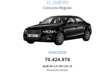 Saiu a um contribuinte da Póvoa de Varzim o carro de gama alta atribuído pelas Finanças para premiar o registo das despesas. A fatura da sorte saiu a quem tinha o cupão com o número 70 424 878 e vai ficar assim com um carro novinho em folha de marca Audi A4. Estavam em jogo quase 320 milhões de cupões referentes ao mês de Novembro. O concurso procura incentivar os contribuintes a pedirem faturas nas transações comerciais, pretendendo evitar a economia paralela e a fuga ao Fisco.