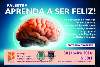 Luís Lameira, autor do programa “Consultório de Psicologia” da Rádio Onda Viva, dá uma palestra amanhã à tarde em Fão, Esposende. A sessão tem um título sugestivo, "Aprenda a ser feliz!", e vai decorrer às três e meia da tarde nas instalações da Junta de Freguesia. A entrada é gratuita.