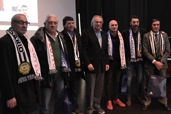 Foi num ambiente de grande cumplicidade "clubística", que o Auditório Municipal da Póvoa de Varzim acolheu ontem à noite uma plateia que se deliciou com histórias do passado alvi-negro. Um painel de convidados da tertúlia varzinista com nomes grandes da carreira desportiva do clube que mantiveram o interesse da sessão e fizeram o tempo voar. O agora treinador Manuel José, mas que jogou na Póvoa durante uma temporada, espera que o Varzim retome o patamar mais elevado no futebol português e agradeceu o convite. Outro nome grande do clube: Leonardo Nunes. É atualmente comentador da Onda Viva e apreciou a tertúlia, esperando que as iniciativas comemorativas possam prosseguir. Comentador na Rádio Onda Viva já foi também Lúcio Pereira, um dos maiores guarda-redes de sempre ao serviço do Varzim tendo inclusive sido chamado à seleção. Ontem sentiu-se bem entre os varzinistas. Na foto, da esquerda para a direita:Cacheira,Leonardo,Lúcio,Manuel José,Lito,Miguel e José Maria.