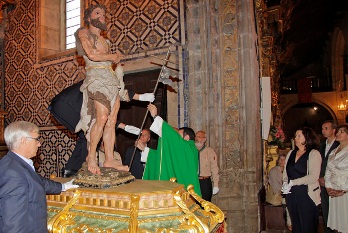 Em Vila do Conde prosseguem os festejos de S. João. Nesta quarta-feira, ao final da tarde a nível religioso, entre outras solenidades, destaca-se um momento que a presidente da Câmara Elisa Ferraz , considera particularmente tocante: a transferência da imagem de S. João do Altar-mor da Igreja Matriz para o Andor Processional. É um pouco depois das 19 horas que acontece a transferência da imagem de S. João. Logo depois decorre a tradicional cerimónia do içar da bandeirinha a S. João, que ficará ao vento no alto da torre da Igreja Matriz.